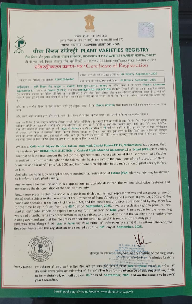 Custard Apple Variety ‘Bhimthadi Selection’ Registered under PPV&FRA Act, 2001